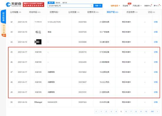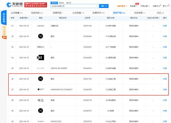 天眼查App显示,华为技术有限公司已申请注册多个“HarmonyOS Connect”图形商标及“鸿蒙智联”商标,国际分类涉及医疗器械、运输工具、科学仪器等,目前商标状态均为商标申请中。