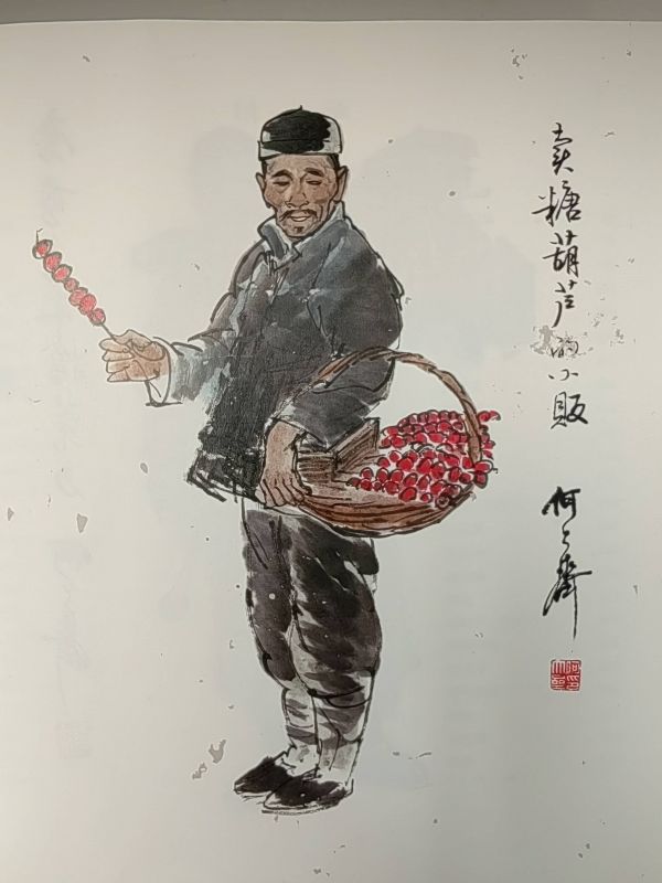 从上个世纪90年代始,他有意识地整理草稿,同时也是在尽可能地抢救传统民俗文化。例如他沿着京西古道、烟袋斜街,去访问当时还在世的老店铺、老字号的继承人,尽量再现和记录下旧时影像,留下了京西古道长卷和烟袋斜街长卷。另外,北京地铁8号线天桥站的壁画,也是采用何先生的民俗画为蓝本。