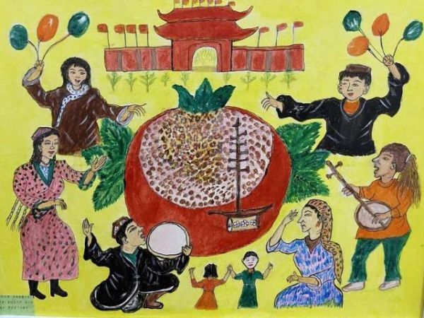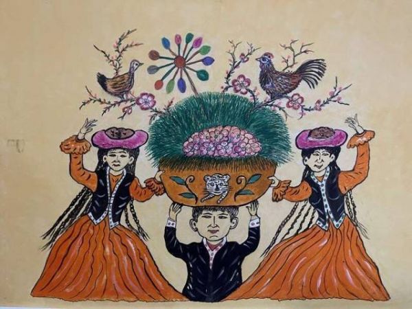 她的画作构图奔放、色彩鲜艳、富有想象。在画作《鱼水情深》中,形象的表达鱼儿离不开水,瓜儿离不开土,各民族谁也离不开谁。在她画的《打馍》中,各种植物“长”在馍上,寓意传承中华民族勤俭节约,要节约每一粒粮食。在她画的《石榴籽》中,各族兄弟姐妹环抱在石榴周围,寓意像石榴籽一样紧紧抱在一起。