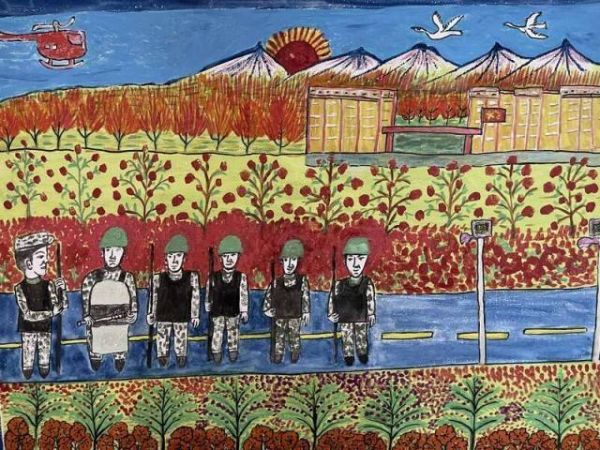 茹则瓦妮汗·库尔班画作《护边员》。中青报·中青网记者 王雪迎/摄