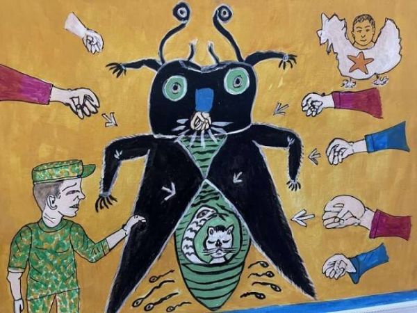 茹则瓦妮汗·库尔班画作《打蝇》。中青报·中青网记者 王雪迎/摄