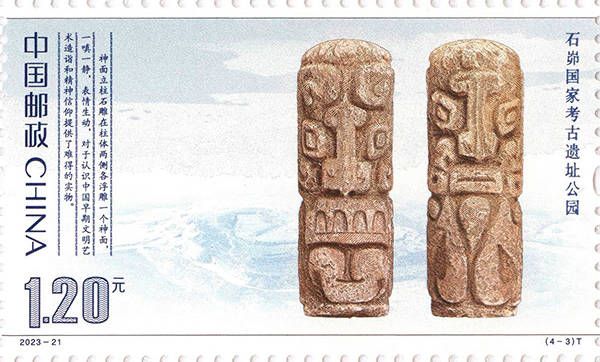 石峁国家考古遗址公园邮票,上面印有神面立柱石雕。图源:中国邮政官网
