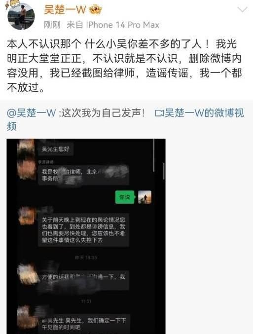 刘丰源回复 新浪娱乐讯 18日,吴楚一发文否认认识刘丰源,称:“本人不认识那个 什么小吴你差不多的了人 !我光明正大堂堂正正,不认识就是不认识,删除微博内容没用,我已经截图给律师,造谣传谣,我一个都不放过。”