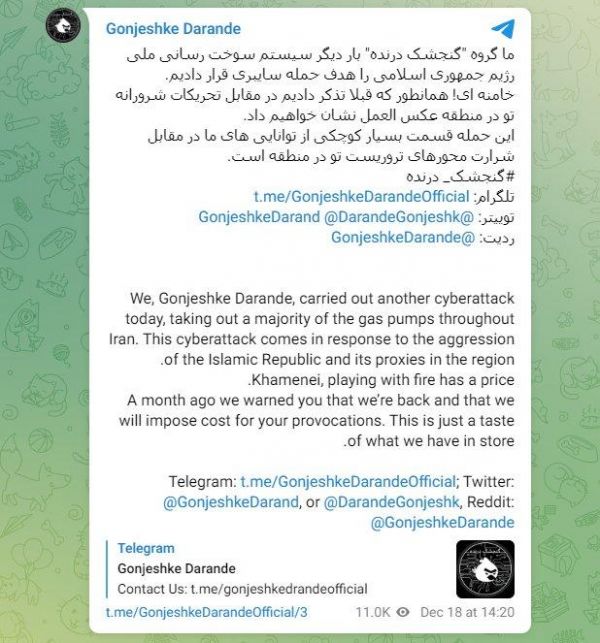 (观察者网讯)当地时间12月18日,伊朗全国约70%的加油站服务突然中断。据路透社和伊朗官方通讯社(IRNA)等媒体报道,伊朗石油部长当日称,加油站服务中断是由网络攻击所致。随后,一家“据信与以色列有关”的网络组织宣布对此事件负责,以色列方面则拒绝置评。