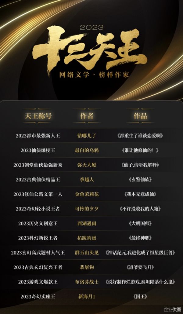 北京商报讯(记者卢扬 韩昕媛)1月10日,阅文集团发布2023年度网络文学榜样作家“十二天王”榜单。错哪儿了、金色茉莉花、季越人、可怜的夕夕、弥天大厦、西湖遇雨、最白的乌鸦等十二位新锐作家跻身榜单。