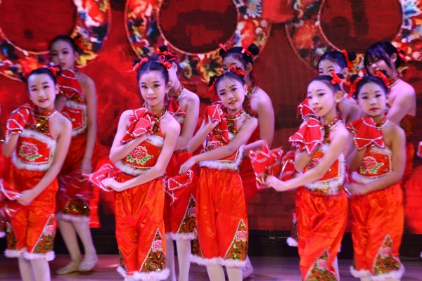 学生们在表演舞蹈《小看戏》(李明发 摄)