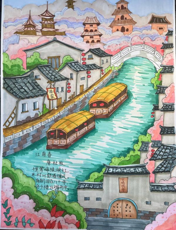 孩子们的作品中有不少描绘江南美好的春景。南京河西外国语学校小学部五年级的陈俊言描绘了杜牧的《江南春》中美好春景:小桥流水,枕水人家,粉墙黛瓦,丛丛绿树映着簇簇红花;依山的城郭、迎风招展的酒旗,一一在望……陈俊言告诉记者,江南的春天真的让人陶醉,流连忘返。这幅画不仅想展现江南水乡春天的美丽景色,更想传达出一种宁静、和谐、生机勃勃的生活氛围。南京怡馨花园小学四年级刘雨瑶的《江南春》意境更悠远辽阔,有千里江南的韵味。