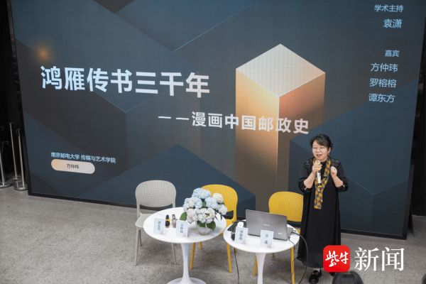 方老师以《漫话中国邮政文化史》一书中动漫角色U点为例,着重讲述了该书的创作过程、特色以及难点。她介绍道,该书的创作历时三年,以时间为序,以漫画故事的方式呈现各历史时期内的邮政知识,兼具学术严谨性与漫画通俗性。比如,书中用“最早的EMS”描述“鸿雁传书”,通过传神的漫画形象,让读者熟知这一传奇故事,进而理解中国邮政徽志中的鸿雁形象。