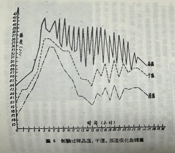 《看曲论》里面其实只讲了一种曲:清茬曲。一直到1957年出版的《汾酒酿造》一书,也就只有一种清茬曲,制曲全过程最高品温不超过42度。这可能有两种情况。一,在明末清初的300多年前,曲的品种还没有进一步细分。二,曲店制曲主要为酿酒服务。根据孟乃昌教授的调查,酿造山西陈醋,喜欢用红心曲、大火曲(后火曲)。太原清徐醋厂和太原益源庆酿造厂就是这样, 它们不怎么用清茬曲, 认为那是酿酒用的。也就是说,山西制曲技术发展到后来,出现了三种类型,只不过酿酒习惯用清茬曲,而酿醋习惯用其他两种。这也就为1964年“汾酒试点”的大曲改革提供了物质前提。