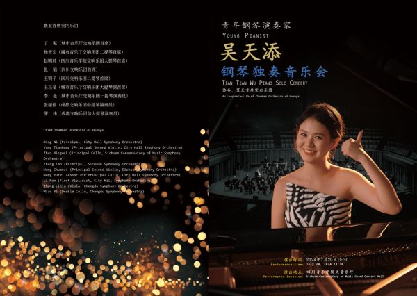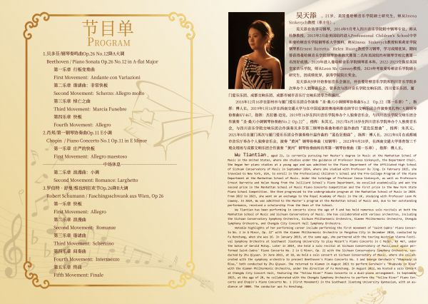 作为美国曼哈顿音乐学院的杰出学生,吴天添自小便展现出非凡的音乐天赋。她9岁开始登台演出,至今已在国内外多个知名音乐厅举办过多场个人独奏音乐会,与众多知名交响乐团合作,积累了丰富的舞台经验。此次在四川音乐学院的演出,是她对家乡音乐事业的又一次回馈,也是对自己音乐旅程的一次重要展示。