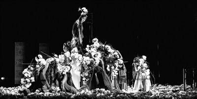 “葬花”与“花葬”两幕并非简单的字词调换,而是反复以花喻人,强调对红楼女儿命运的悲悯。“葬花”的收尾场景是层层帘幕遮掩,舞台顶光垂下,宝玉与黛玉共读《西厢》,身后白茫茫一片,纯洁干净。而“花葬”则是十二金钗脱下华服,仅着不同颜色来区分彼此。褪去了具体身份的女性走向了共同的命运,都入了薄命司;演员们在高椅之上起舞,如同在墓碑之上挣扎。花谢花飞飞满天的飘零景象在此刻成为无声的呐喊,十二金钗的命运也由此成为所有女性的命运。