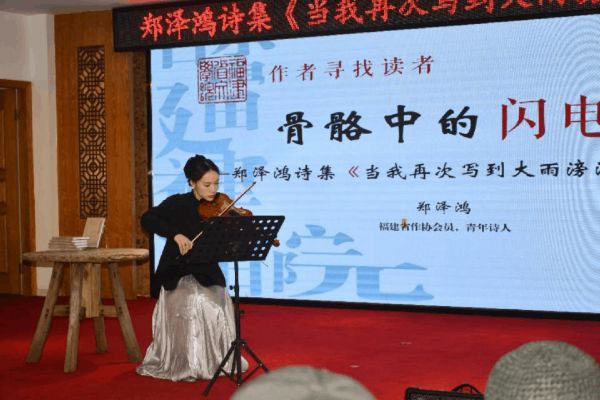 在分享会的互动环节,福建省广播影视集团主持人聊俊海,福州市朗诵艺术爱好者顾革文、韩欣恬还现场朗诵诗集《当我再次写到大雨滂沱》的部分作品,小提琴手傅香慈,福州微氪乐队主唱、自由音乐人林辉先后带来了精彩的表演节目,赢得了现场观众的热烈掌声。