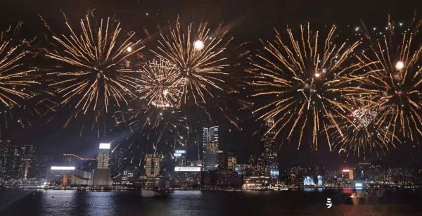 在维多利亚港的夜空下,烟花绽放出各种绚丽的色彩,每一幕都充满了创意与深意。