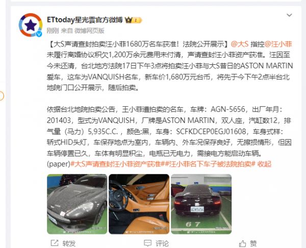 10月17日,据台媒报道,大S指控汪小菲未履行离婚协议积欠1,200万余元费用未付清,声请查封汪小菲资产获准。汪因至今未还清,台北地方法院17日下午3点将拍卖汪小菲与大S昔日的ASTON MARTIN爱车,这车为VANQUISH名车,新车价1,680万元台币,将先于今下午2点半台北地院门口公开展示,随后拍卖。