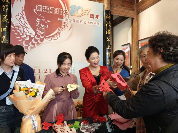 11月21日,在“新福建建设十周年——高少萍剪纸艺术传承展”上,剪纸艺术家高少萍(右四)和大家互动。新华社记者 许雪毅 摄