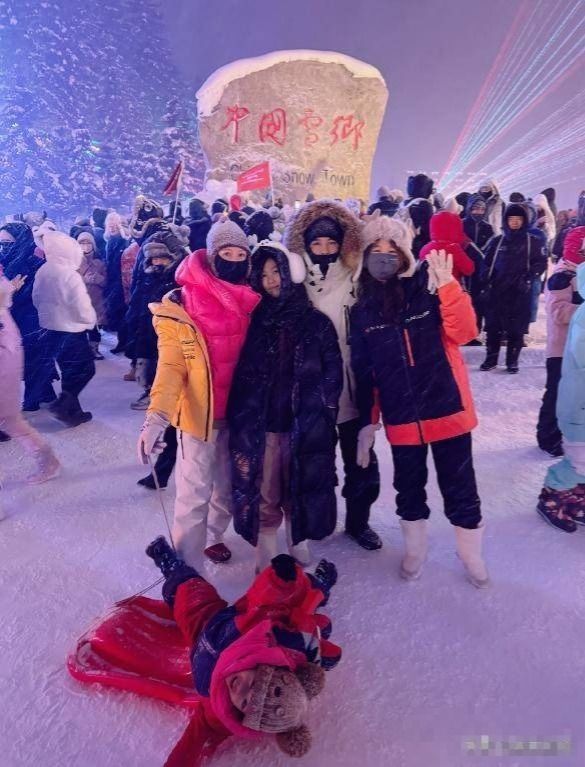 蔡少芬一家现身哈尔滨!怕冷穿两件羽绒服,小儿子躺在雪地超开心