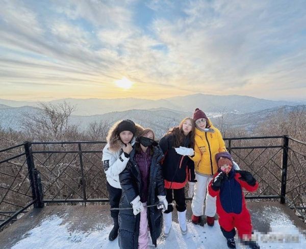 画面中,蔡少芬一家5口合影留念,由于天气比较冷,从南方过来更是需要注意保暖,因此蔡少芬一家人均两件羽绒服,穿的十分厚重,一家人同框拍照,蔡少芬站在儿子身后,女儿则将头靠在妈妈的肩膀上,张晋则趴在女儿肩膀,一家人温馨有爱。