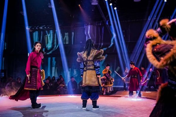 “在皎洁的月色下,花木兰决定替父从军;飘雪的寒夜里,木兰和战士们一起在战场上厮杀。”街区最盛大的表演当属《楚地长歌》大剧,在三楼剧场,百余位演员参演,灯光舞美全新升级,重现了木兰出征的盛大场景。在可360度旋转的观众席上,游客们可以近距离观赏花木兰骑马从天而降的壮观场景,进一步了解《木兰传说》的英雄故事。