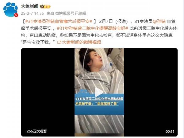 2月7日(报道),31岁演员孙铱血管瘤手术后报平安。此前,孙铱透露二胎生化后去体检,查出患动脉瘤,称如果不是因为生化去检查,都不知道身体里有这么大隐患:“是宝宝救了我。”