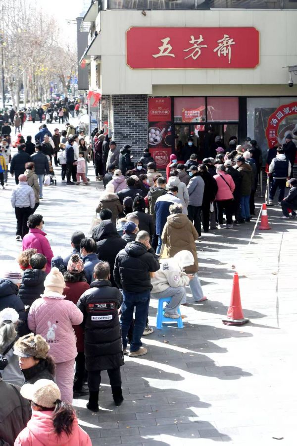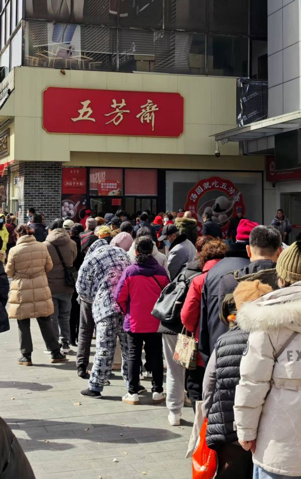 2月7日的武汉,虽有阳光照耀,但横行的大风仍像刀一样刮在脸上。当天气温骤降,依然挡不住顾客的热情。记者在武汉五芳斋总店看到,店门口再现大排长龙的景象,排队绵延数十米。门店内,6台机器同时运转,十几位师傅同时制作。武汉五芳斋相关负责人介绍,店里从每日6时30分一直工作至19时许,还需每人限购两盒,基本上能满足顾客需求。