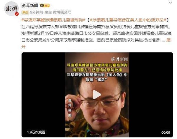 2月初19日,导演兼商人郑某峰被曝因涉嫌在海南招募演员时猥亵儿童被警方刑事拘留,目前已报检察院拟对其进行批准逮捕。据江西抚州当地媒体2019年公开报道显示,郑某峰在电影《美人鱼》中扮演的“郑总”,被网友怒赞比主角还要出彩。