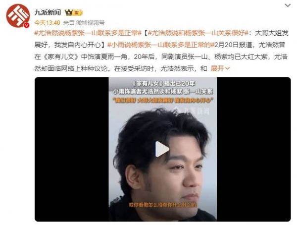 2月20日报道,尤浩然曾在《家有儿文》中饰演夏雨一角,20年后,同剧演员张一山、杨紫均已大红大紫,尤浩然却面临网络上种种议论。在接受采访时,尤浩然表示,和杨紫张一山关系很好,“每一部杀青大家都是痛哭流涕,大哥大姐(张一山、杨紫)这几年发展很好,我发自内心开心。”尤浩然称,杨紫和张一山初中就读于同一学校,大学时期又是同学,有更多联系是很正常的,网友有时候把事情扩大化了。