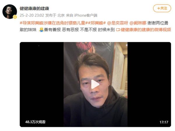 建康还表示,当年他在剧组里还给郑某某当过司机,郑某某坐的是迈巴赫,住的是高级酒店,在剧组呆了一年左右,他没有收到小演员的求助,也没有听过郑某峰猥亵的传闻。两三年后才从朋友口中听说了当时剧组内“恶劣”的情况,在郑某峰家乡江西省抚州市黎川县拍戏时,“晚上他会叫一些没有家长带着的小朋友到他的房间试戏,继续磨剧本,不知道做了些什么。”