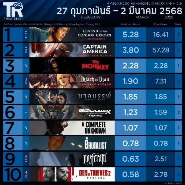 搜狐娱乐讯 近日,据媒体报道,肖战主演的电影《射雕英雄传:侠之大者》蝉联泰国票房周冠军。 据悉,《射雕英雄传之侠之大者》于2月20日在泰国公映,首周在曼谷和清迈两地获得票房收入865万泰铢(人民币187万元),成功斩获周冠军。随后全国总票房达到1180万泰铢(人民币256万元),创造了2021年至2025年间华语片在泰国的最佳周票房纪录。