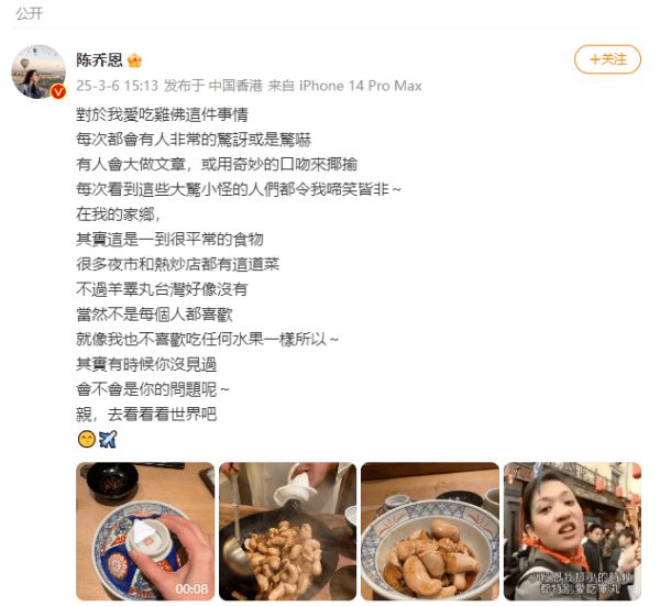 3月6日,陈乔恩发文回应自己爱吃鸡佛(鸡睾丸),她表示这是一道很平常的食物。此前,陈乔恩曾因在节目中透露自己爱吃睾丸等各种动物内脏,网友对此评价不一。