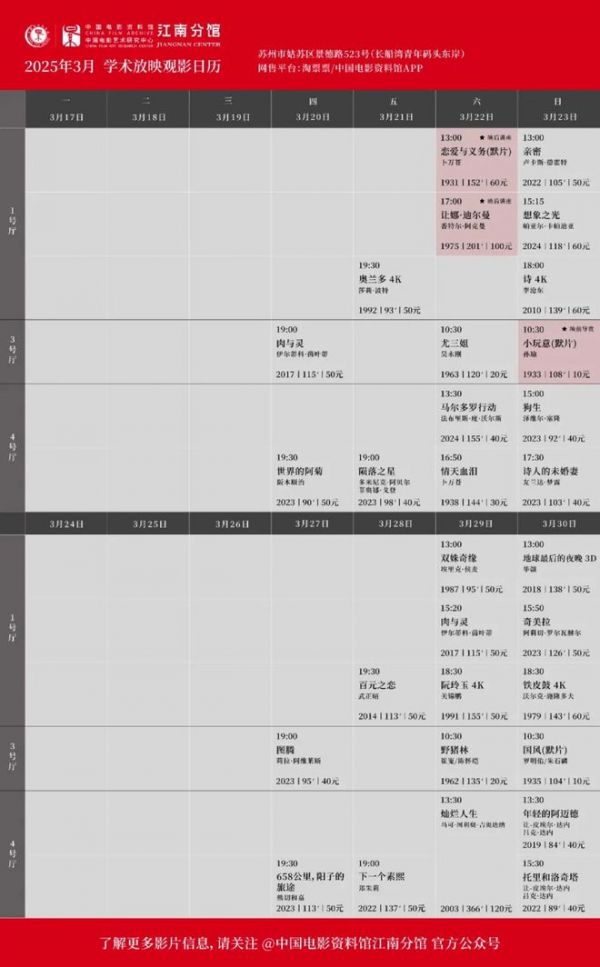 4月江南分馆放映片单下周一公布,敬请关注。所有场次均可在淘票票、中国电影资料馆APP购票,具体排片见末图,祝大家观影愉快。❤️
