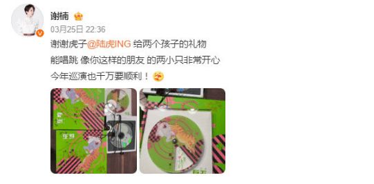 搜狐娱乐讯 25日晚,吴京妻子谢楠晒出陆虎送给孩子的CD礼物,并配文称:“谢谢虎子给两个孩子的礼物,能唱跳 像你这样的朋友 的两小只非常开心。”