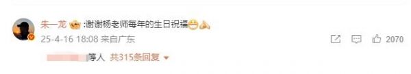 随后,朱一龙在评论区留言感谢道:“谢谢杨老师每年的生日祝福。”