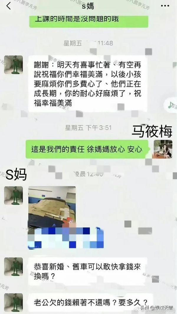 S妈真面目被揭穿!5月20日,狗仔葛斯齐icon晒出S妈和马筱梅icon的聊天记录,聊天记录里S妈凌晨找马筱梅要钱,还发了汪小菲icon之前留在台湾icon被抵押的汽车照片,询问马筱梅:“你老公欠的钱赖着不还吗?还要多久?”而俩人前面的聊天记录,还是S妈祝汪小菲和马筱梅新婚快乐的内容,以及拜托俩人照顾好孩子。但下一秒就找马筱梅要钱,且马筱梅让她来看孩子,她也根本不接茬。很显然S妈想要的从头到尾都只是钱,根本没想过要抚养两个孩子,也没多关心孩子,她只是拿孩子当借口,拿孩子塑造人设方便她找汪小菲要钱。这才是她的真面目,什么爱女儿,爱外孙和外孙女都是假的。而且就算汪小菲欠大Sicon钱,如今大S去世了,两个孩子是跟着汪小菲的,汪小菲要还钱也是给两个孩子,不会给S妈和具俊晔icon,因为给了他们就是白给,两个孩子占不到任何好处。更重要的是,大S之前状告汪小菲拖欠抚养费icon,可是孩子现在都是汪小菲抚养了,抚养费应该就两相抵消了,S再来要钱,这吃相实在是有些难看了。