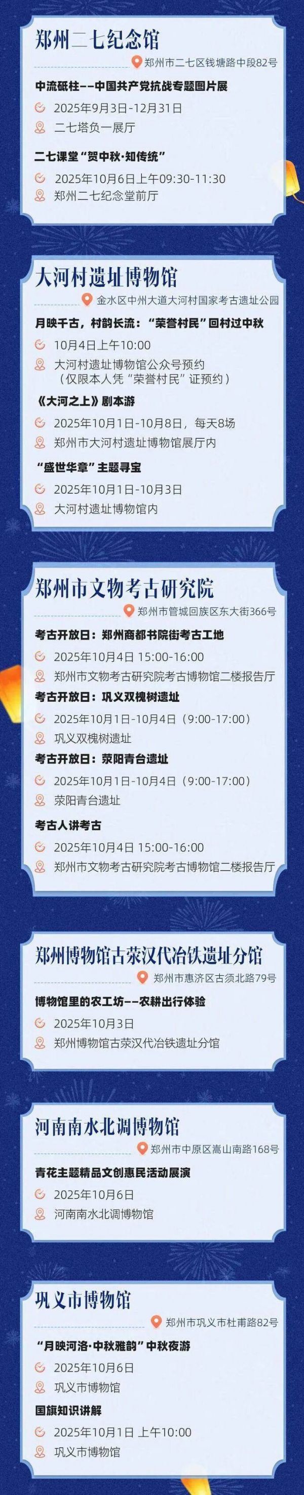 针对双节期间市民文化需求激增的特点,在市区郑州博物馆、郑州商代都城遗址博物院、郑州二七纪念馆等6家重点国有博物馆实行延时开放服务,确保市民及游客有充足时间参与活动、感受文化魅力。