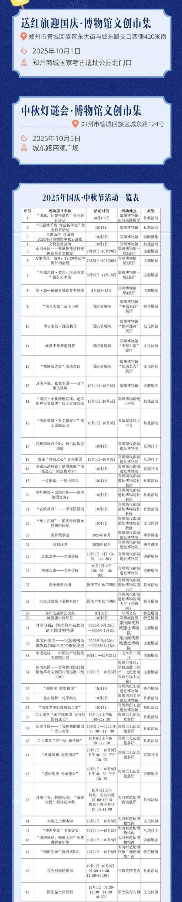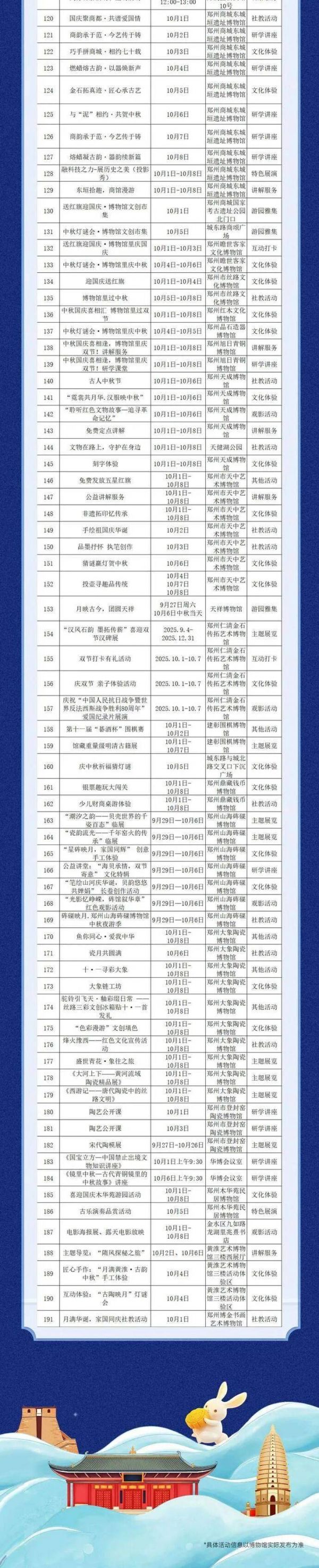 记者从郑州市文物局获悉,为切实满足市民群众的节日文化需求,充分展现郑州作为“商都文化之城”的独特魅力,今年国庆中秋假期,郑州市文物局以“郑是金秋 月满商都”为主题,精心策划了10类191项多彩纷呈的活动,为广大市民群众呈现丰富多彩的节日文化盛宴。