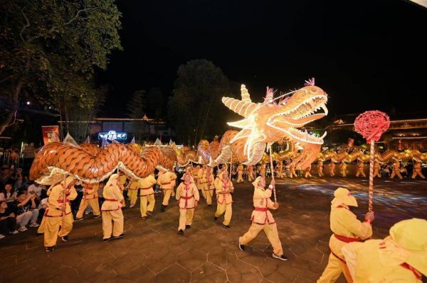 成都邛崃市平乐镇旅游发展办公室主任陆舜鸿介绍,为了给市民及游客更好的旅游体验,平乐古镇以“千年鱼龙舞”为主题开展了一系列传统文化活动,融合炫彩竹龙巡游、川剧变脸、民谣音乐等10余种演出场景,为大家打造一场穿越千年的文化盛宴。