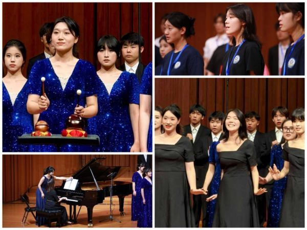 气势如虹的终曲《怒吼吧!黄河》作为《黄河大合唱》的收束篇章,以磅礴的气势揭示抗日的浪潮。作品中段描绘民族苦难的深重,末段则通过五次附点与三连音节奏交替递进的“战斗警号”,不断激发内在张力。在沈金云的指挥与付镜伊老师的钢琴伴奏引领下,音乐情绪由“怒—静—悲—激”层层推进,直至沸腾。最终,这种情绪与力量在反复高扬的“战斗警号”与渐强的呐喊声中汇聚成排山倒海的终极高潮。