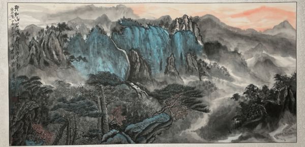 作品讲述:《群山》是石瑛以传统水墨为基底创作的山水杰作,全幅以青灰与蓝绿为主调,通过墨色浓淡的精妙晕染,构建出“万壑归心”的诗意空间。作品采用三段式构图:前景松枝以细笔勾勒,针叶如铁,暗喻生命之韧;中景高山以斧劈皴法层叠堆砌,岩壁肌理如刀削斧凿,既显山体之巍峨,又寓岁月之沧桑;背景远山则以淡墨轻染,与缭绕的云烟融为一体,形成“心随境远”的虚实流转。