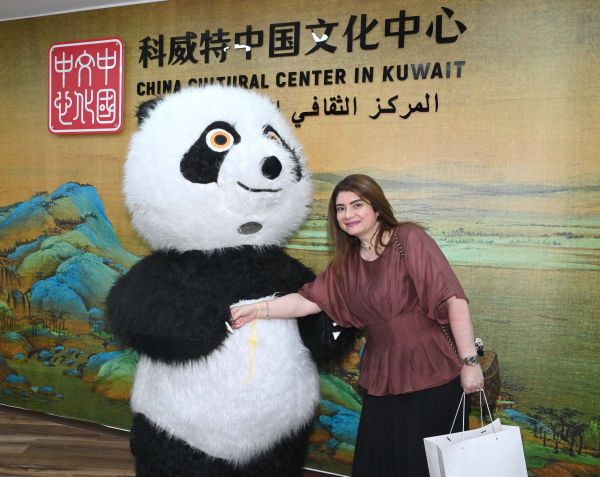 10月12日,在科威特哈瓦利省,一名女子在科威特中国文化中心与熊猫人偶互动合影。 新华社发(阿萨德摄)