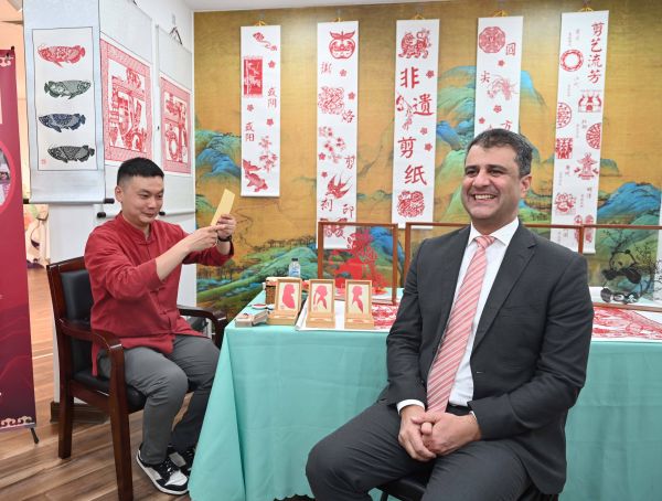 10月12日,在科威特哈瓦利省,一名男子在科威特中国文化中心体验中国剪纸肖像。 新华社发(阿萨德摄)