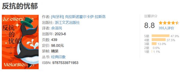 《反抗的忧郁》是一本阅读门槛很高的书,也是一本悲观的书,是作者对匈牙利内部革命的讽刺。但是我们依旧能够透过作者超现实主义的笔调和高度跳跃的叙事结构,感受到属于拉斯洛的语言艺术之美。