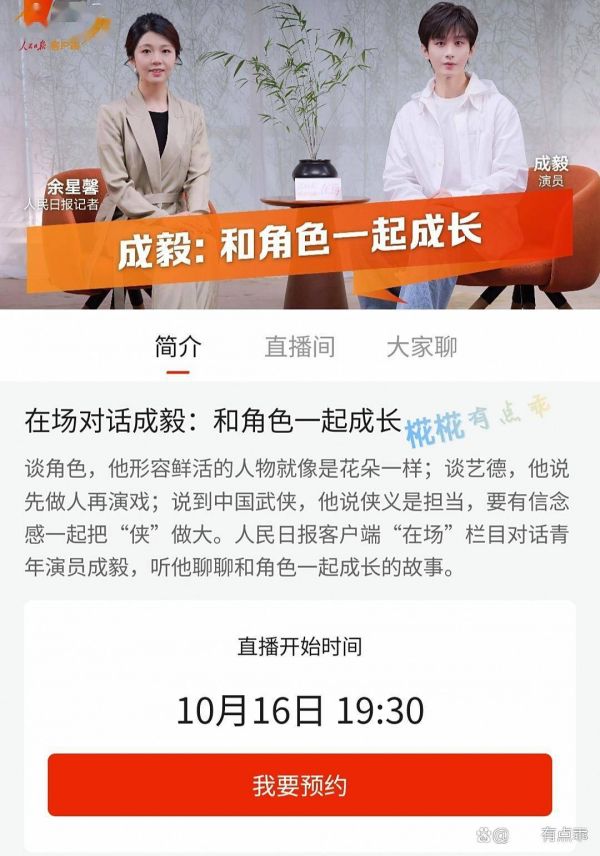 近日,由人民日报发布的关于成毅访谈节目正式开启预约。小伙伴们可以提前预约啦!
