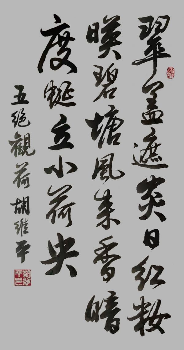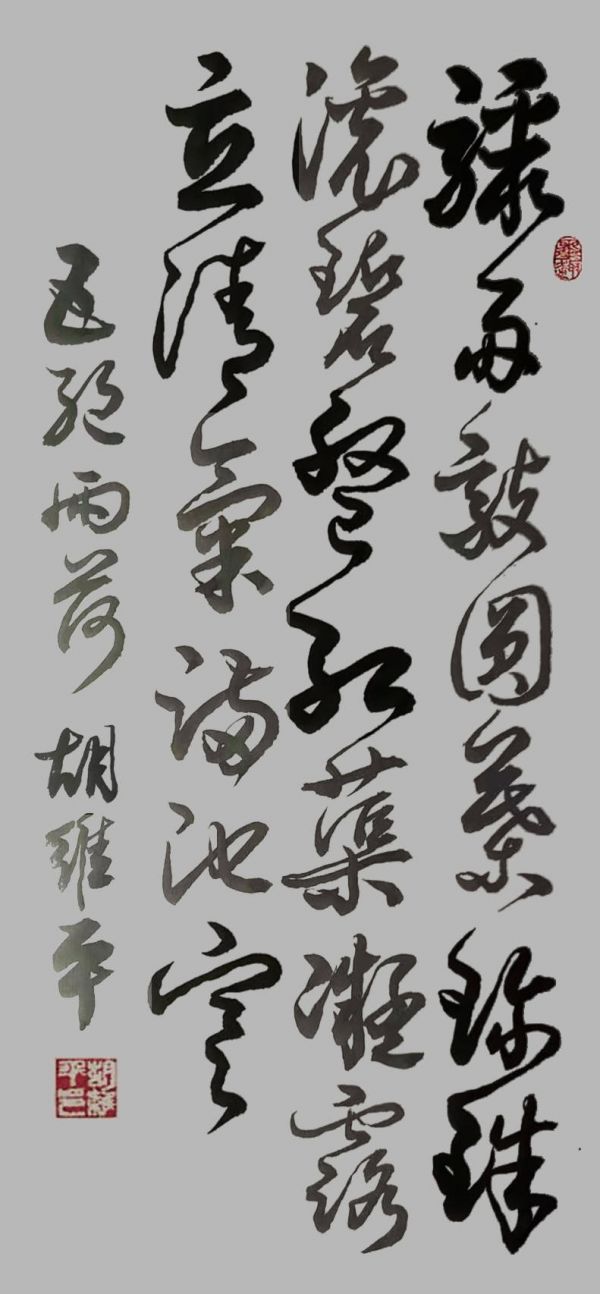 形式语言:传统与创新的激情共舞在形式语言上,胡维平的书法与绘画相互借鉴、彼此渗透,同时又各自绽放出独特的魅力。书法创作中,他是一位博采众长的艺术大师,如虔诚的学者般研习古代大家的经典之作,汲取笔法、墨法、气韵、章法的精髓。其行书如行云流水,雄浑中透着和谐,似奔腾的河流,既有磅礴的气势又不失细腻的柔情;草书如狂风骤雨,自由奔放,线条简练而富有张力,似翱翔的雄鹰,充满了激情与壮志。