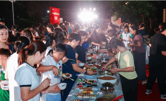 夜幕降临,融侨外滩CD区的广场上,三十六张圆桌整齐排列,社区居民们纷纷端出精心烹制的拿手好菜:佛跳墙的醇香、荔枝肉的酥脆、鱼丸汤的鲜美……一道道具有闽都特色的佳肴汇聚成“舌尖上的中秋”。邻里围坐一堂,品美食、话家常,孩子们嬉笑奔跑,现场弥漫着温馨氛围。