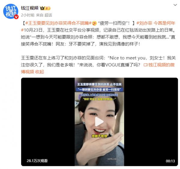 10月23日,演员王玉雯在社交平台分享了一段记录红毯活动准备过程的视频。当提到当天可能见到刘亦菲时,她瞬间笑逐颜开:“一想到今天可能要跟刘亦菲合照,简直不敢想象!今天只要能见到她我就......”话未说完已笑得合不拢嘴,网友纷纷调侃“这分明是演我见到偶像的样子”。