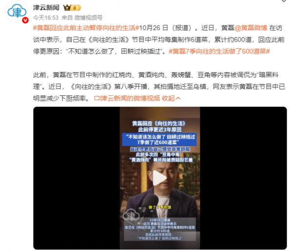近日,黄磊在访谈中谈及《向往的生活》制作历程。他透露在七季节目中平均每集制作6道菜,累计完成约600道菜品。对于节目暂停的原因,他表示:“田种过,秧插过,当时选择停下来正是因为不知道该如何继续。停下时我感到特别轻松。”