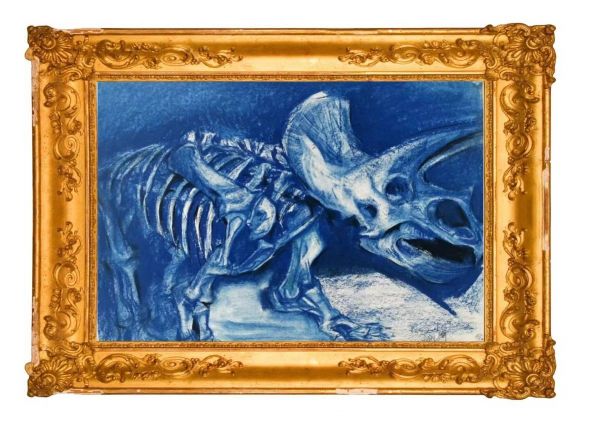 2024年3月,曲胜麟首次亮相UWEE卢浮宫国际艺术展,其作品《返古——恐龙时代》(第三张)以恐龙骨骼为核心元素,通过碳粉画的细腻笔触还原史前生物形态,并暗含生态警示主题。作品从全球青年创作者中脱颖而出,获得展方“小艺术家”称号。一年后,他携该系列第四幅作品再次受邀参展。新作在科学性与艺术性上进一步突破,通过碳粉层次的明暗对比,将恐龙骨骼与地质岩层融合,呈现生命由繁盛至消逝的历史厚度。