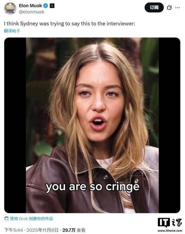24 分钟后,马斯克又发布了一段由 Grok 生成的视频:视频中女演员西德妮・斯威尼(Sydney Sweeney)以一段明显与其本人声音特质不符的合成语音说道:“你真是尴尬到家了。”