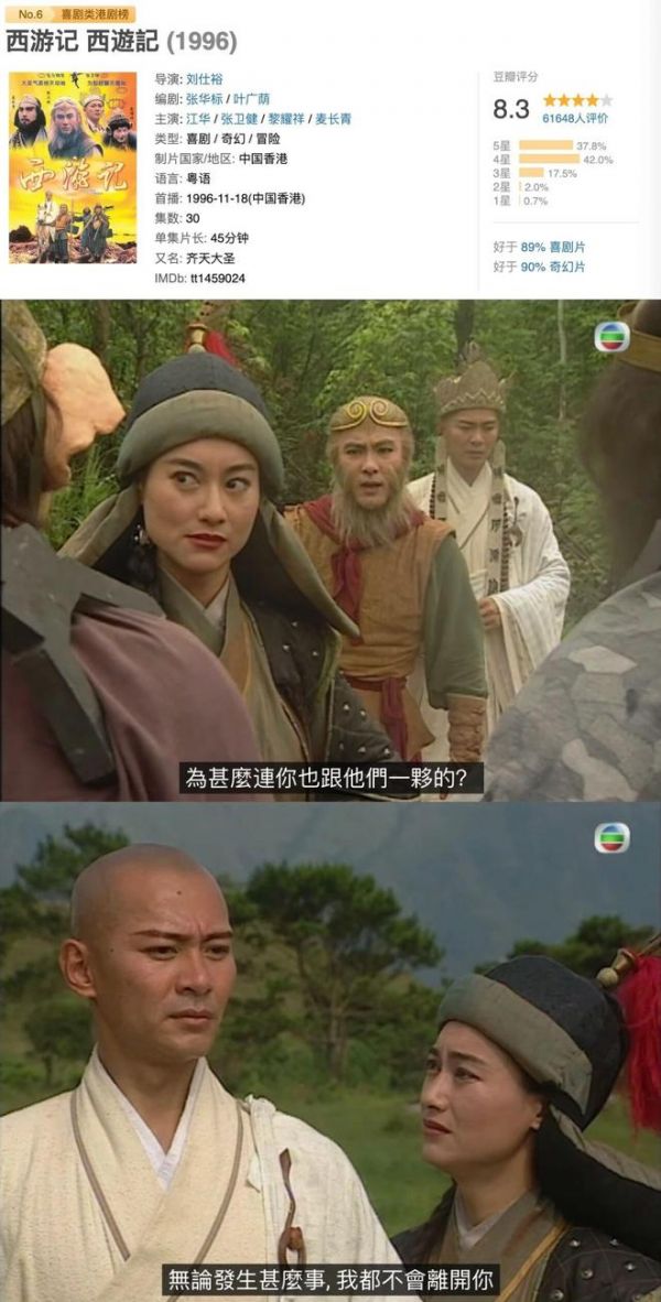 3、《96版西游记》。师徒四人途经女儿国,遇到惠英红饰演的“飞虎大将军”。飞虎对唐僧一见钟情,执迷不悟,为了让唐僧嫁给自己,甚至做出一些疯狂的行为,结局却被唐僧以佛法点化……短短几集,惠英红将一个女将军的贪嗔痴恨演绎得淋漓尽致,发人深省。再次感慨,《96版西游》的编剧和演员都太牛了。