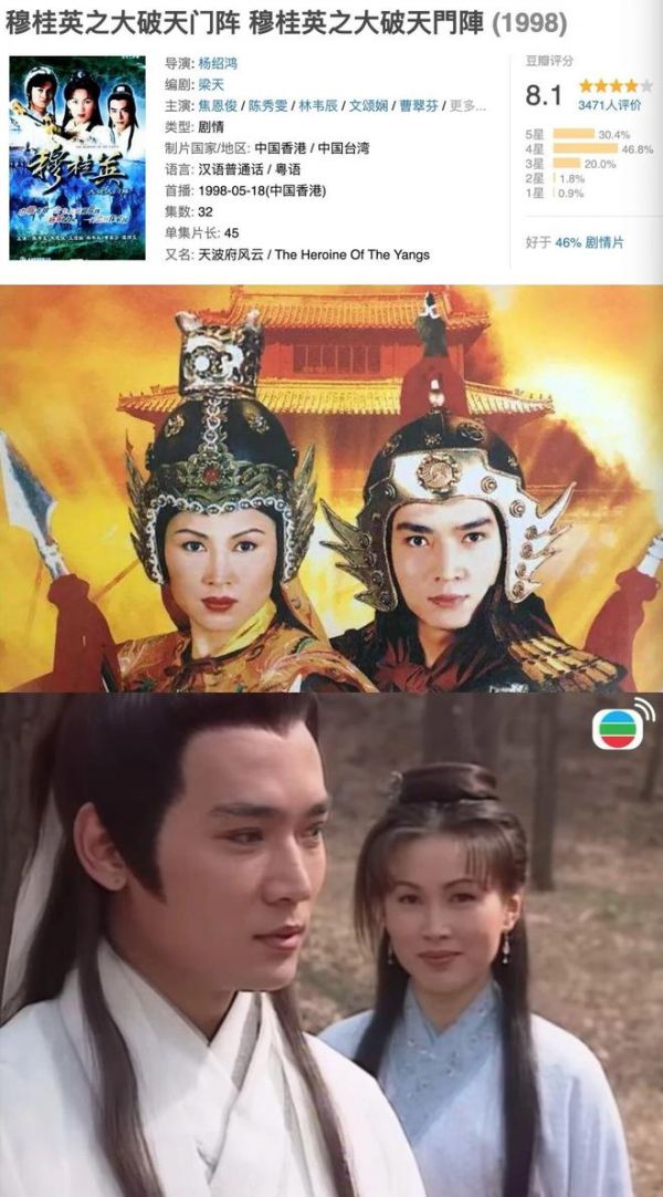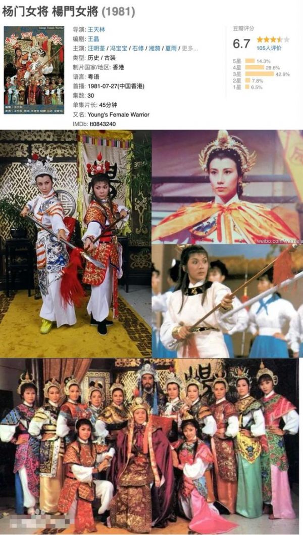 4、《杨门女将》。1981年TVB出品的经典剧集,汪明荃演穆桂英,冯宝宝反串演杨文广,巾帼群像里既有阿姐的英明神武,也有冯宝宝的少年气,整体妆造和画风,颇有粤剧大戏的感觉。